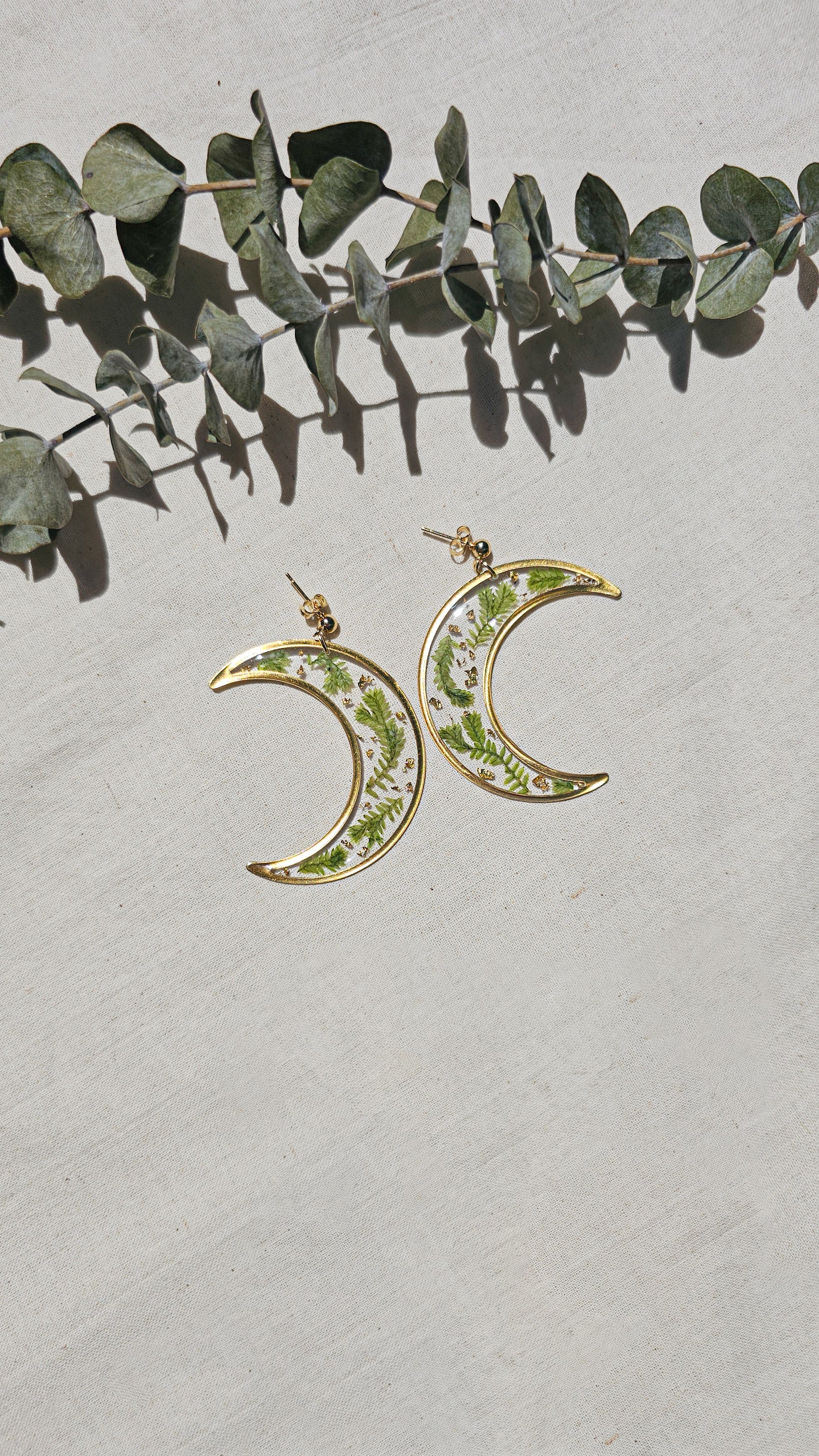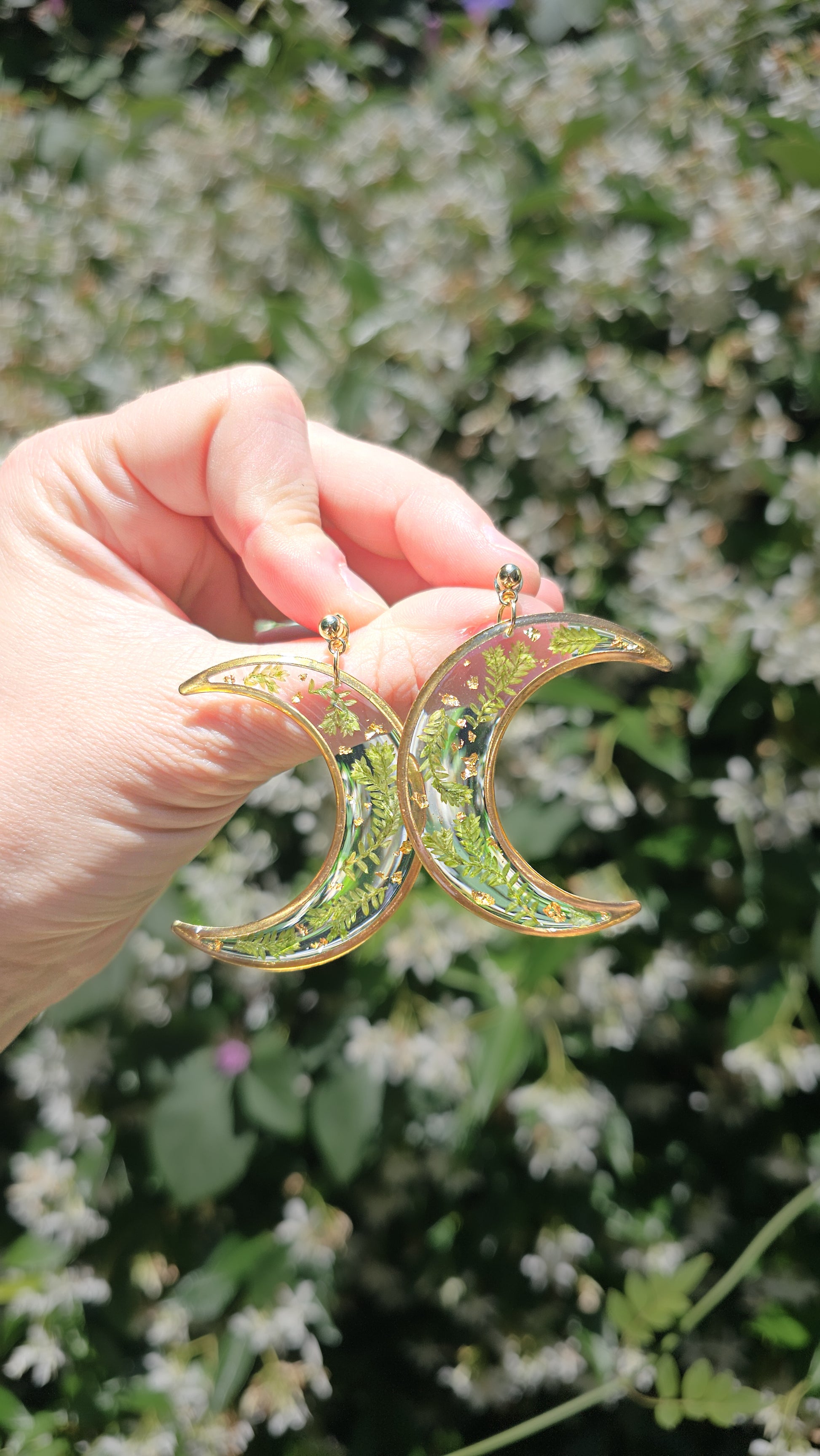 Moon shaped pendants filled with moss and goldflakes in resin.